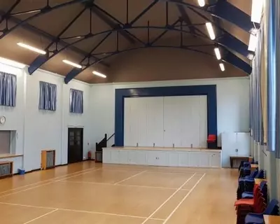 There is a stage at one end and a roof high enough that the badminton people are happy. There is a large hatch through into the kitchen, which can be used to warm up and serve food and cooking.